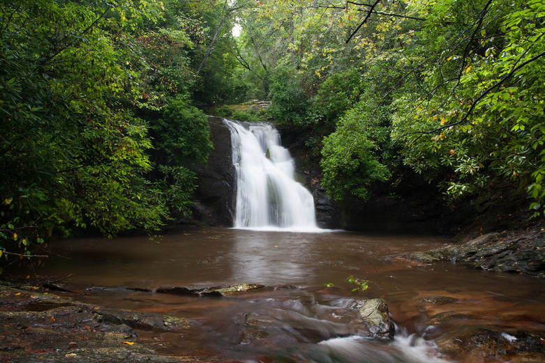 Blue Hole Falls located on High Shoals Creek in the High Shoals Scenic Area of the Chattahoochee National Forest in Towns County, Georgia, United States. The falls can be accessed via the High Shoals Trail, a well-maintained 1.2 mile trail to the larger High Shoals Creek Falls downstream.