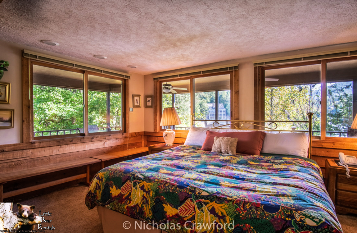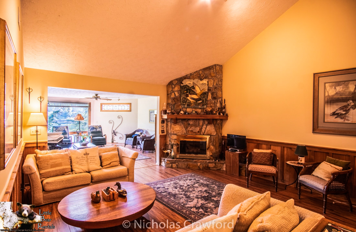 At day's end, you’ll need to decide where you’ll have a nice glass of wine--next to the floor-to-ceiling stone gas-log fireplace in the dining area or outside amid the beautiful lake and mountain scenery.