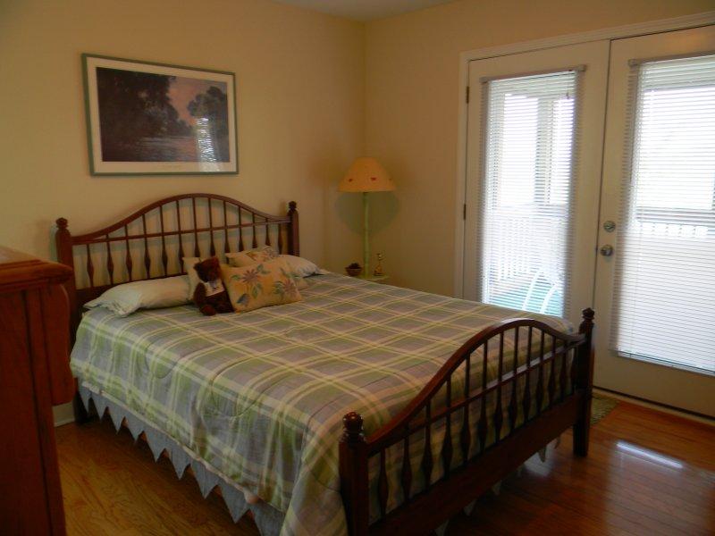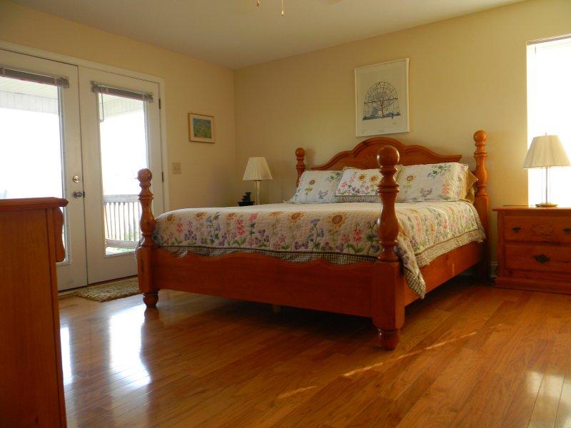 The master bedrrom has a king bed.  The second bedroom has queen bed and a door leading out to the screened porch, where you can sit and enjoy the view. The third bedroom has 2 twin beds.